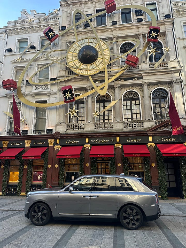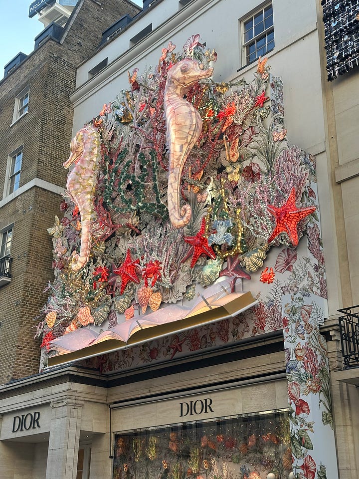 Old Bond Street— Where all the luxury stores compete to have the best Christmas lights on the block. Dior had a beautiful sea-themed lighting set up last year and Chanel was wrapped in a classic tweed bow.